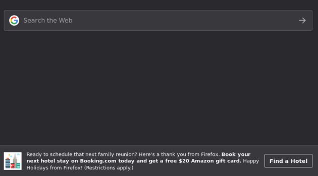 L’inserzione pubblicitaria è iniziata ad apparire in Firefox 64 per desktop negli ultimi giorni del 2018. Il messaggio conteneva un ringraziamento per gli utenti da parte di Mozilla e suggeriva di prenotare un hotel su Booking.com, in modo da ricevere una carta regalo di Amazon del valore di 20 dollari. Il pulsante “Find a hotel” portava quindi al noto sito di prenotazioni. La novità è stata ovviamente accolta in maniera negativa dato che non è stata preannunciata, a differenza dei contenuti sponsorizzati di Pocket.