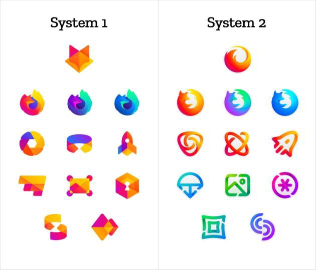 Il nuovo design prevede un approccio a quattro livelli corrispondenti alle cinque righe nell’immagine. Sulla prima riga è presente la “masterbrand icon” che viene utilizzata nei materiali pubblicitari, in occasione degli eventi e sul Google Play Store. Si tratta quindi dell’icona associata al marchio Firefox. Sulla seconda riga ci sono le icone del browser general-purpose (versioni stabile, developer e nightly), evoluzione dell’icona di Firefox Quantum.