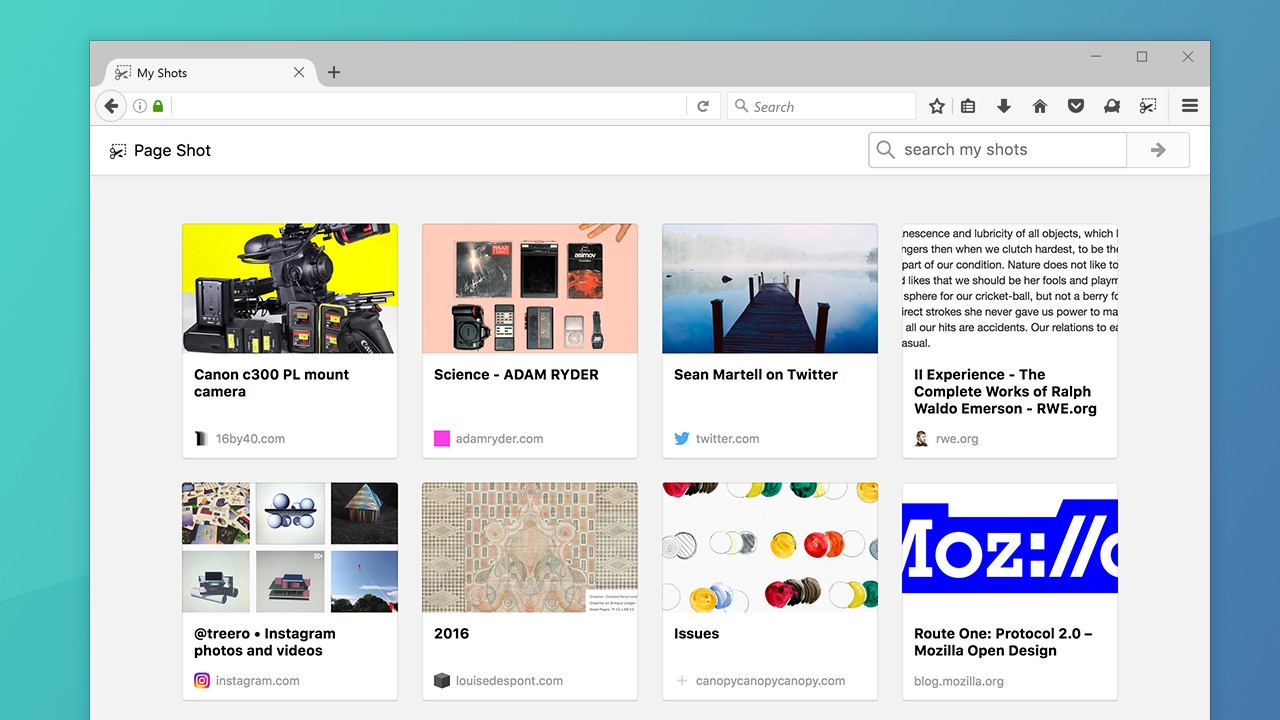 Page Shot è la versione potenziata del tasto Print Screen (o Stamp). Invece di avere uno screenshot dell’intera pagina è possibile selezionare solo l’area di interesse e salvare l’immagine. Il link può essere condiviso sui social network e via email, senza dover scaricare e allegare un file. Le miniature degli screenshot vengono mostrate all’interno di una apposita sezione e l’utente può effettuare una ricerca, dato che Page Shot indicizza il titolo della pagina web e il testo.