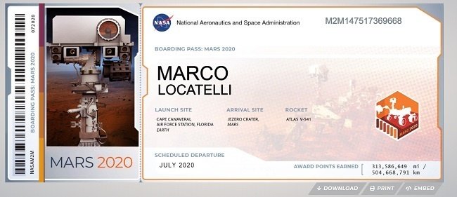 Completando l’iscrizione, si otterrà una vera e propria carta di imbarco per Marte (vedi immagine sottostante), che sarà poi possibile condividere sui social, scaricare in formato png o stampare. Sarà possibile inviare il proprio nominativo entro il 20 settembre 2019. Al momento i nomi sono oltre 2 milioni.