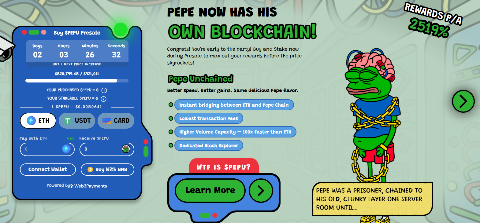 Pepe Unchained ($PEPU) è una nuova soluzione Layer 2 che sfrutta il fascino iconico del meme Pepe the Frog. Le meme coin della rana hanno mostrato un’enorme crescita quest’anno e la loro capitalizzazione di mercato è aumentata dell’11,5%, più del doppio di quella del mercato più ampio delle meme coin. Ora Pepe ottiene la sua blockchain con Pepe Unchained.