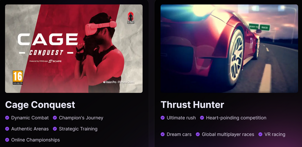“Cage Conquest”, la prima versione di 5thScape, metterà i giocatori sul ring con combattenti MMA, offrendo combattimenti dinamici e percorsi di allenamento personalizzati. I giochi futuri includono “Thrust Hunter”, un gioco di corse automobilistiche che mette i giocatori al posto di guida, e “Immersive Kickoff”, un gioco di calcio che consente ai giocatori di unirsi alle loro squadre preferite sul campo.