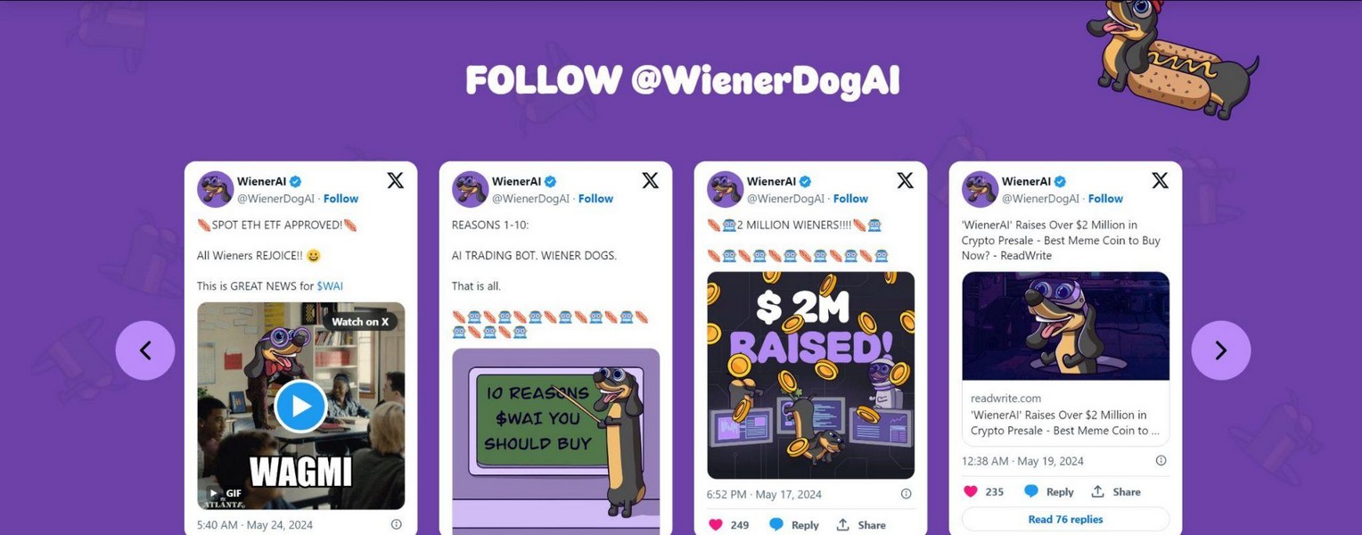 Capito questo, non è difficile comprendere il potenziale di WAI, il quale potrebbe diventare un asset dal valore inestimabile. Se questo cane salsiccia riuscirà a cavalcare il treno delle meme coin e a diventare il punto di riferimento del mercato per gli investitori che cercano consigli, allora difficile pronosticare quanto in alto potrà andare.