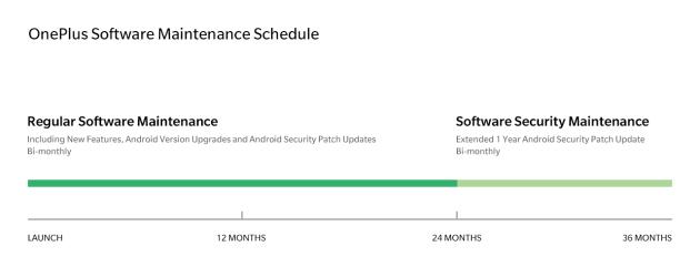 La roadmap di OnePlus è suddivisa in due parti: Regular Software Maintenance e Software Security Maintenance. La prima prevede la distribuzione degli aggiornamenti per due anni dal lancio dello smartphone sul mercato. Gli update includono nuove versioni di Android, nuove funzionalità, patch di sicurezza bimestrali e bug fix. La seconda prevede invece un ulteriore anno di patch sempre a cadenza bimestrale. In pratica il supporto terminerà dopo tre anni dall’avvio delle vendite. La roadmap si applica a OnePlus 3/3T, OnePlus 5/5T e OnePlus 6.