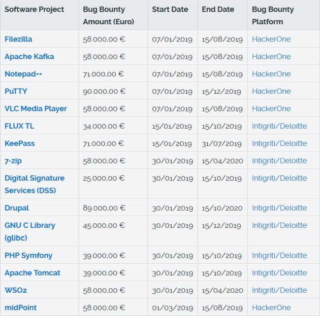 La terza edizione del progetto prevede 15 programmi bug bounty, 14 dei quali inizieranno tra il 7 e il 30 gennaio 2019 (il quindicesimo che riguarda midPoint inizierà il 1 marzo 2019). La somma disponibile è compresa tra 25.000 e 90.000 euro. I software sono: FileZilla, Apache Kafka, Notepad++, PuTTY, VLC Media Player, FLUX TL, KePass, 7-Zip, Digital Signature Services (DSS), Drupal, GNU C Library (glibc), PHP Simfony, Apache Tomcat e WSO2.
