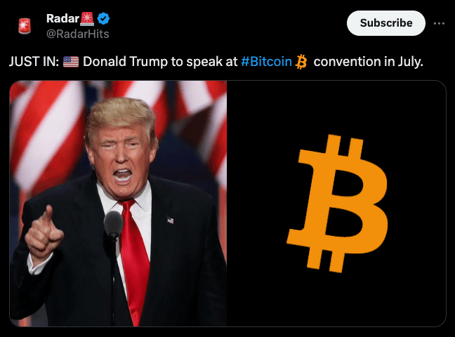 Inoltre, sono emersi rapporti secondo cui Donald Trump parlerà alla convention Bitcoin il prossimo mese. Tutto ciò ha entusiasmato il pubblico delle criptovalute.