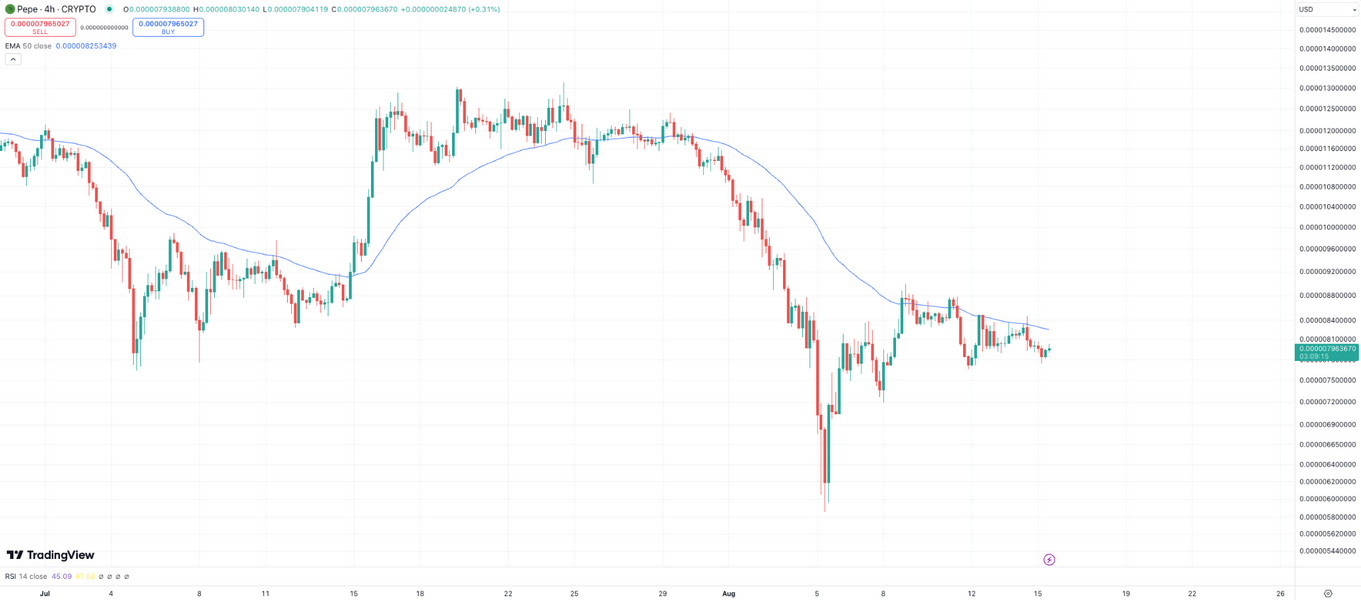 PEPE ha ha creato un canale discendente sul grafico a 4 ore e il suo Relative Strength Index (RSI) si aggira intorno a 43.