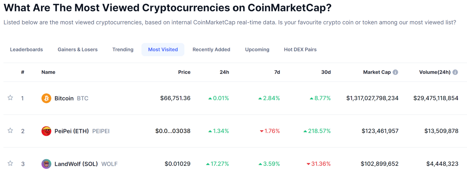 Non sottovalutano nemmeno i cloni di Pepe e le altre crypto a tema rana. Ad esempio, PeiPei, noto anche come il Pepe coin cinese, è attualmente la seconda criptovaluta più visitata su CoinMarketCap dopo Bitcoin.