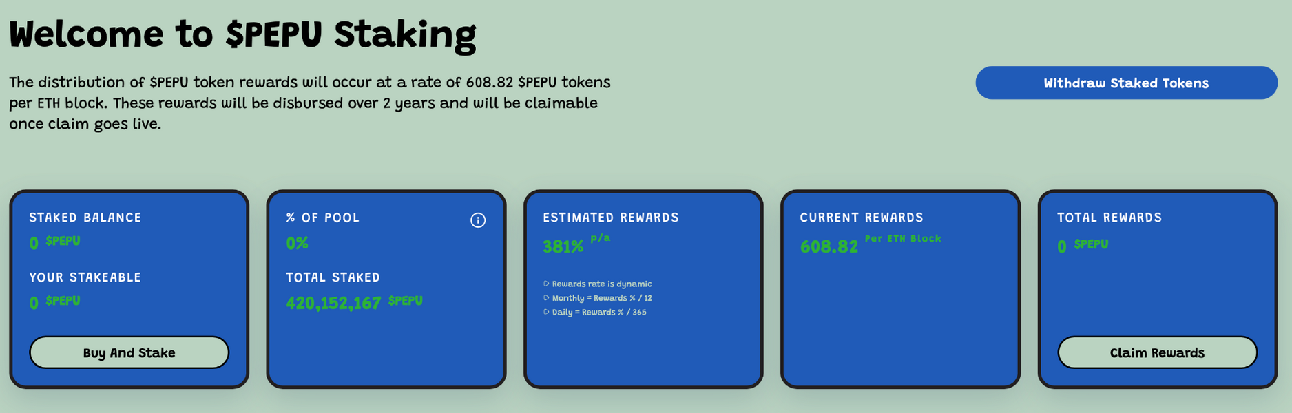 Mentre Ethereum offre un APY di staking del 7%, Pepe Unchained offre un APY del 381%.