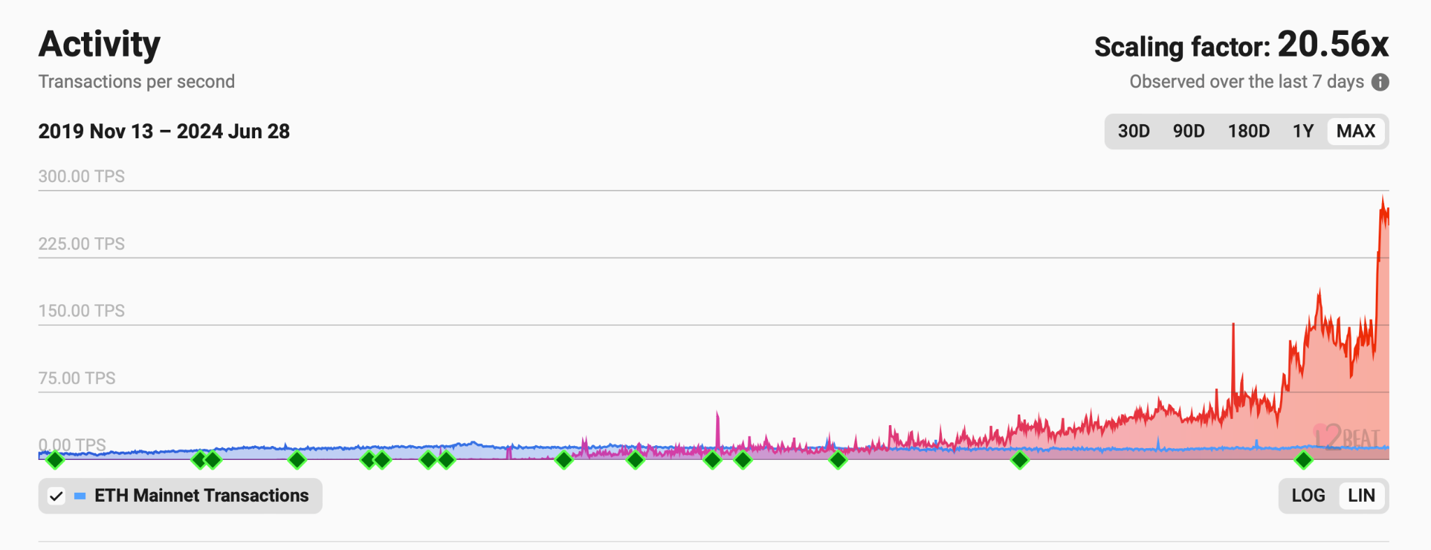 È stato un enorme vantaggio per Ethereum, con i dati di L2BEAT che hanno dimostrato che il numero di transazioni che si verificano sul livello 2 ha raggiunto oltre 250 al secondo, ovvero oltre 10 volte in più rispetto a gennaio 2023.