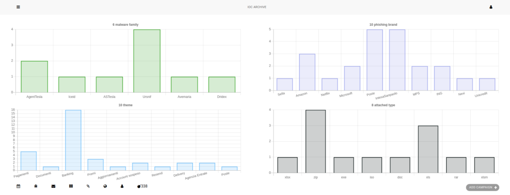 Nell’insieme, la scorsa settimana l’Italia è stata colpita da circa trentaquattro campagne malevole, di cui 29 mirate specificatamente al nostro Paese. Queste hanno sfruttato dieci temi, di cui il principale continua a essere il “Banking” per veicolare diverse famiglie di malware, sulle quali spicca Ursnif/Gozi.