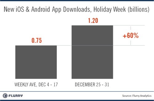 Nel suo ultimo rapporto, Flurry Analytics stima infatti che nell’ultima settimana del 2011 siano state scaricate oltre 1,2 miliardi di applicazioni su dispositivi iOS e Android, identificando una impennata pari al 60% in più rispetto ad una settimana qualsiasi.