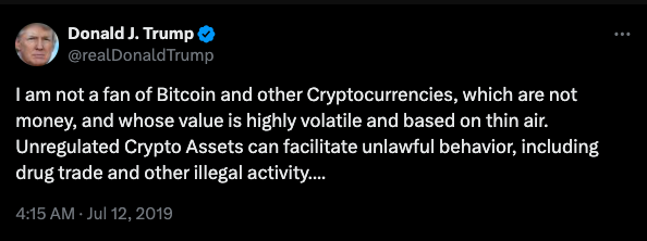 Trump, si ricorderà, è stato generalmente critico nei confronti delle criptovalute. Egli ha ribadito molte delle solite accuse mosse dai politici, ovvero che le crypto sono “basate sul nulla” e che vengono utilizzate per spaccio di stupefacenti e altre attività illecite.