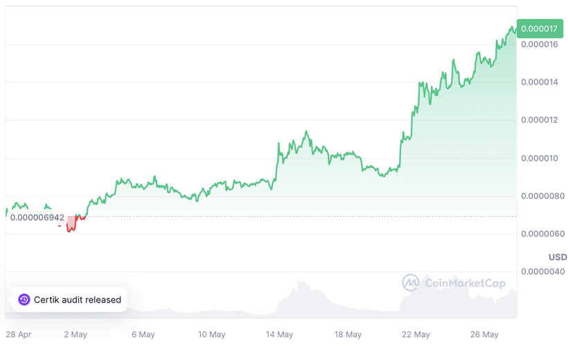 Pepe Coin è stata una delle criptovalute più performanti a maggio. Secondo CoinMarketCap, la meme coin a tema rana ha registrato un rally del 140% nell’ultimo mese, registrando i guadagni più alti tra le prime 100 criptovalute. Crypto Daily ha riferito che PEPE ha lanciato oggi Uniswap e Polygon e ora ha gli occhi puntati sul protocollo NEAR.