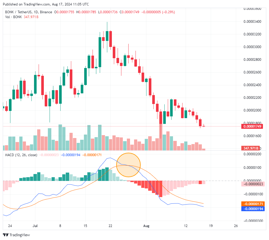 Nonostante ciò, BONK è riuscita a mantenere un livello di supporto intorno a 0,00001796$. C’è un crossover rialzista nell’indicatore Moving Average Convergence Divergence (MACD), suggerendo una possibile ripresa e un movimento al rialzo.