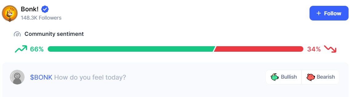 Sul fronte sociale, CoinMarketCap rivela che il sentimento della comunità attorno a Bonk è ribassista del 34%.