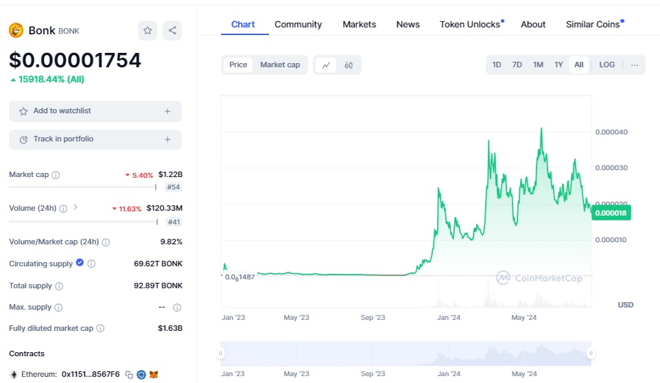 La storia dei prezzi di BONK è stata segnata da fluttuazioni drammatiche, caratteristiche dei meme coin e della loro natura volatile. Dopo il suo lancio, BONK ha registrato un aumento di valore, guidato dal trading speculativo e dal crescente interesse all’interno della comunità Solana.