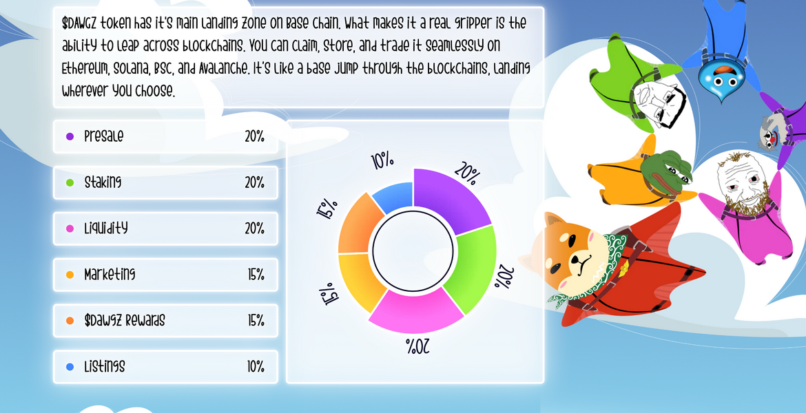 Secondo il sito web di Base Dawgz, il 20% dei token è assegnato allo staking e il 15% alle ricompense $DAWGZ. Gli altri sono divisi tra fornitura, liquidità, marketing e quotazioni di borsa.