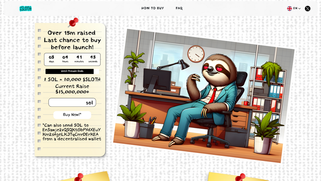 Slothana è una delle principali meme coin in prevendita sulla rete Solana. Durante la sua campagna ICO, il progetto ha raccolto più di 15 milioni di dollari. Ciò lo rende un favorito nel circuito delle prevendite, superando Book of Meme e Slerf.