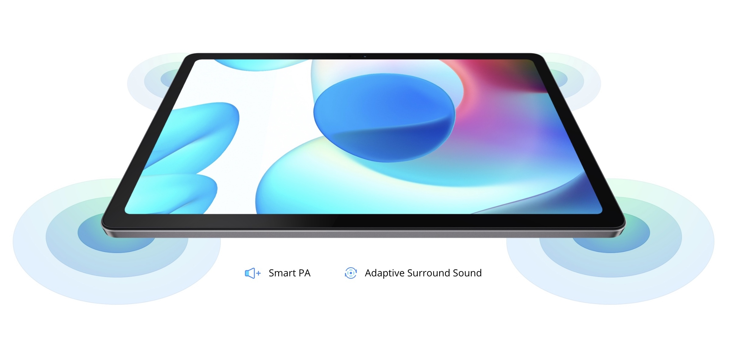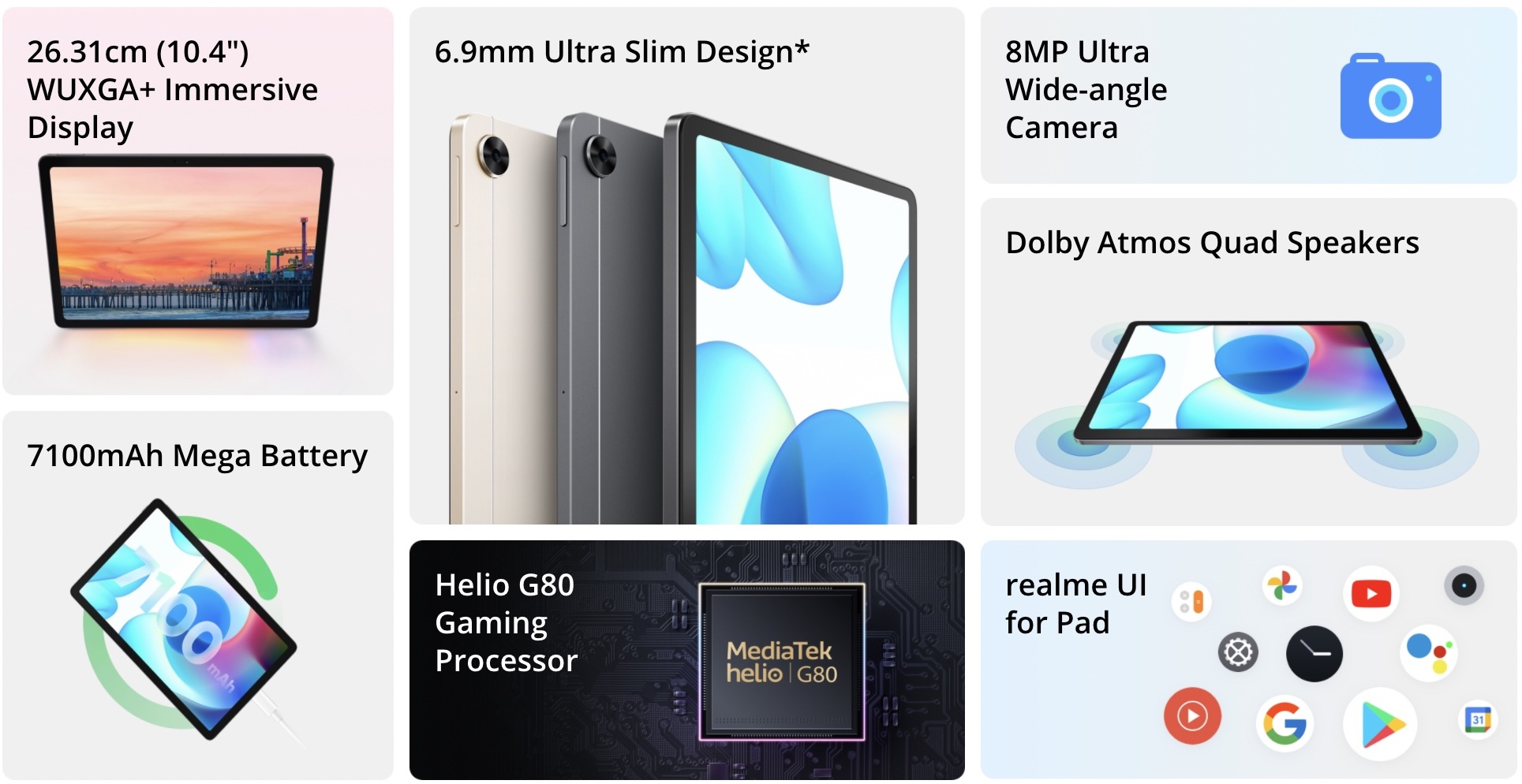 Realme Pad vanta una fotocamera principale da 8MP e una frontale da 8MP, ben quattro speaker Dolby Atmos posizionati sui quattro lati del dispositivo e una batteria da 7.100mAh che assicura fino a 12 ore di visione di un video e ben 65 giorni in standby. RealMe Pad supporta anche la ricarica rapida da 18W e la ricarica inversa.