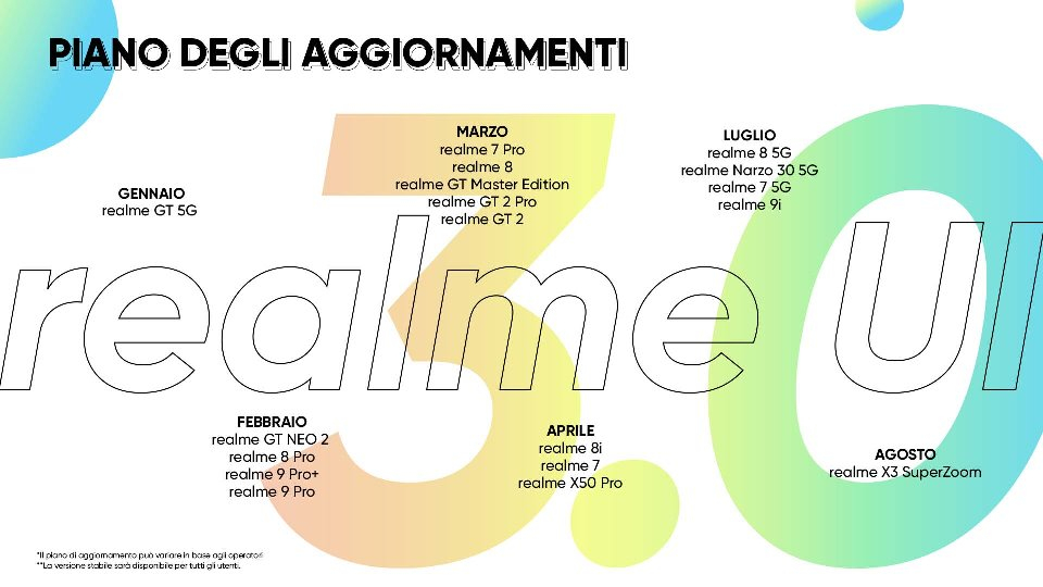 Nello specifico gli aggiornamenti sono già partiti – anche in Italia – per il realme GT, e a breve coinvolgeranno tutti gli altri modelli secondo il seguente calendario: