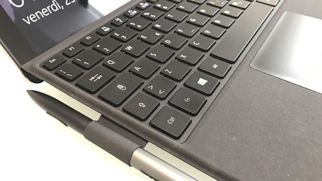 La tastiera è simile a quella in plastica del modello di Redmond, ma non è retroilluminata (lo è solo in versione Core i7, non disponibile in Italia, come detto). È comoda da usare, con tasti dalla corsa breve e dal buon feedback. Unica, piccola pecca è il modo in cui la superficie si flette se si premono i tasti con troppa convinzione, cosa che non accade con quella del Surface Pro 4. Entrambe di attaccano magneticamente in maniera ferma.