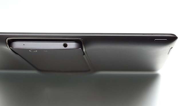 Il tablet è realizzato in plastiche di buona qualità. La slitta che consente di agganciare lo smartphone appare ben realizzata, con una presa molto salda, uno scorrimento preciso e una grande facilità d’impiego. Tale caratteristica contribuisce però ad aumentare le dimensioni del tablet, in particolare lo spessore, che difatti risulta maggiore di quello visto in numerosi competitor recenti (10,6 mm nel punto più profondo).
