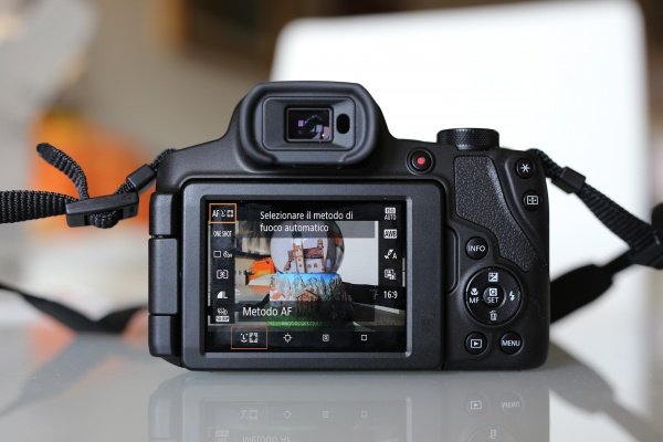 Il monitor LCD TFT posteriore, stranamente in formato 4:3 quando la maggior parte dei concorrenti ne adotta uno 16:9, è totalmente orientabile e vanta una risoluzione di 920.000 pixel. Purtroppo, non è di tipo touch e su una bridge come questa avrebbe fatto comodo.