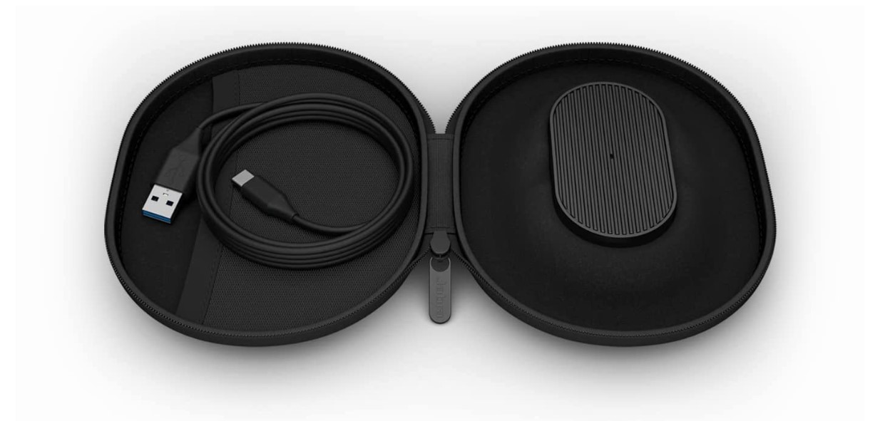 La Jabra PanaCast 20 4K, con il suo telaio tutto nero e la costruzione in metallo, offre un aspetto sofisticato e di alta qualità. Il suo design compatto e la custodia con cerniera inclusa la rendono estremamente portatile e pratica per spostarsi tra stanze e uffici diversi. Le forme ricordano quelle di una classica webcam per PC, con l’apposita aletta per l’aggancio allo schermo del portatile o al bordo superiore di un monitor esterno. All’interno della confezione di vendita troviamo anche un cavo per la connessione a PC e Mac e una pratica custodia protettiva per il trasporto.