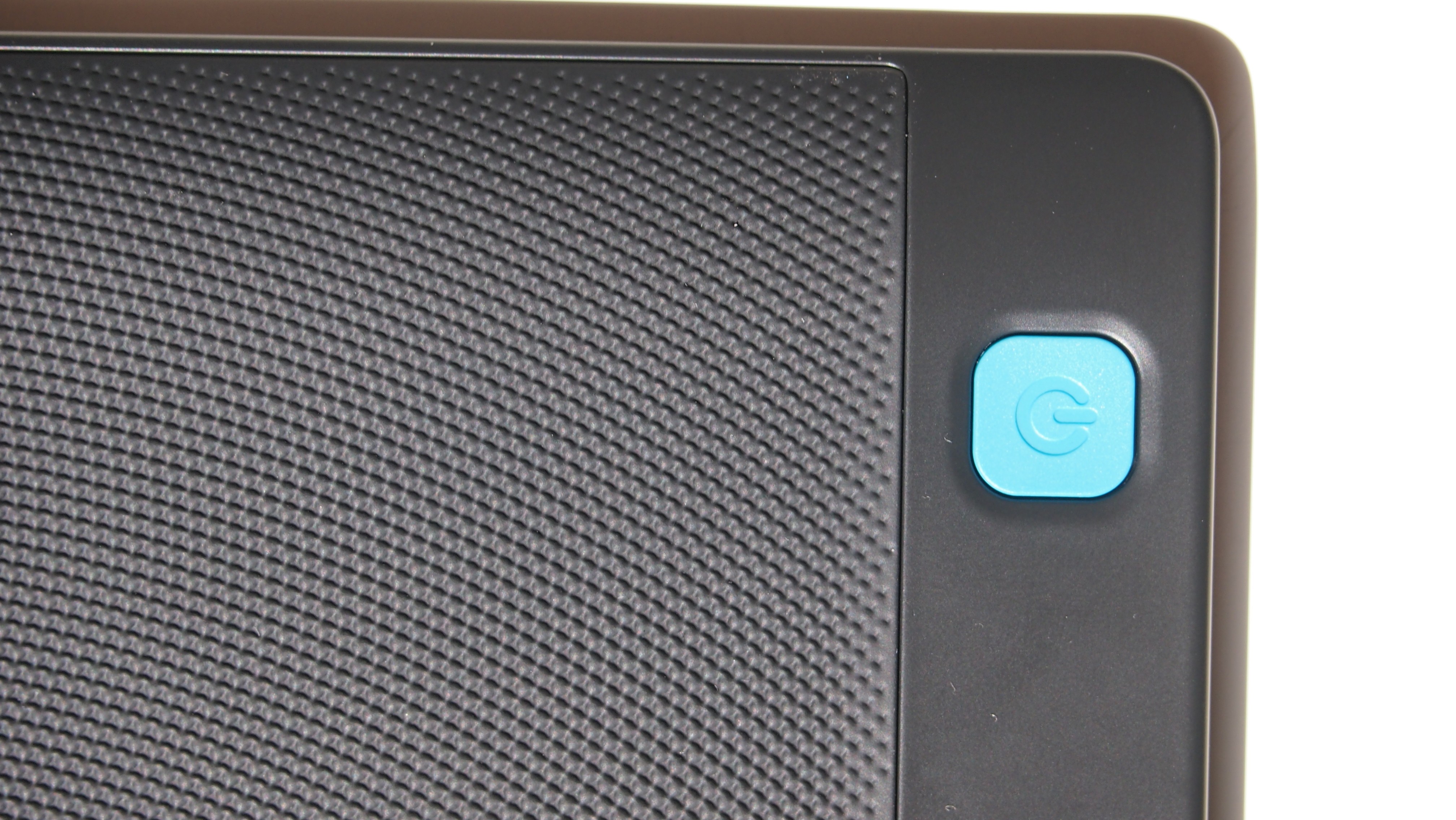 Sul retro spicca il tasto di accensione/stand-by di un azzurro luminoso, che genera un piacevole contrasto visivo con la scocca gommata nera.