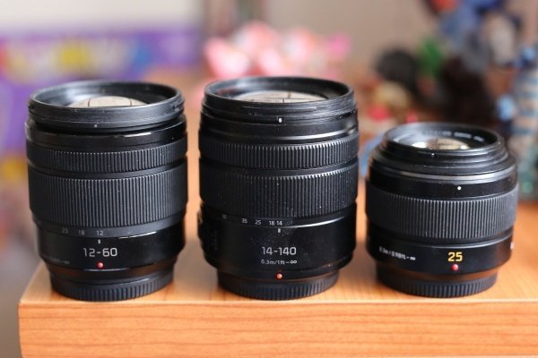 Da sinistra: Lumix G Vario 12-60mm f/3.5-5.6 OIS, Lumix 14-140mm f/3.5-5.6 Asph Lumix G Vario Power OIS e Leica DG Summilux 25mm f/1.4 ASPH