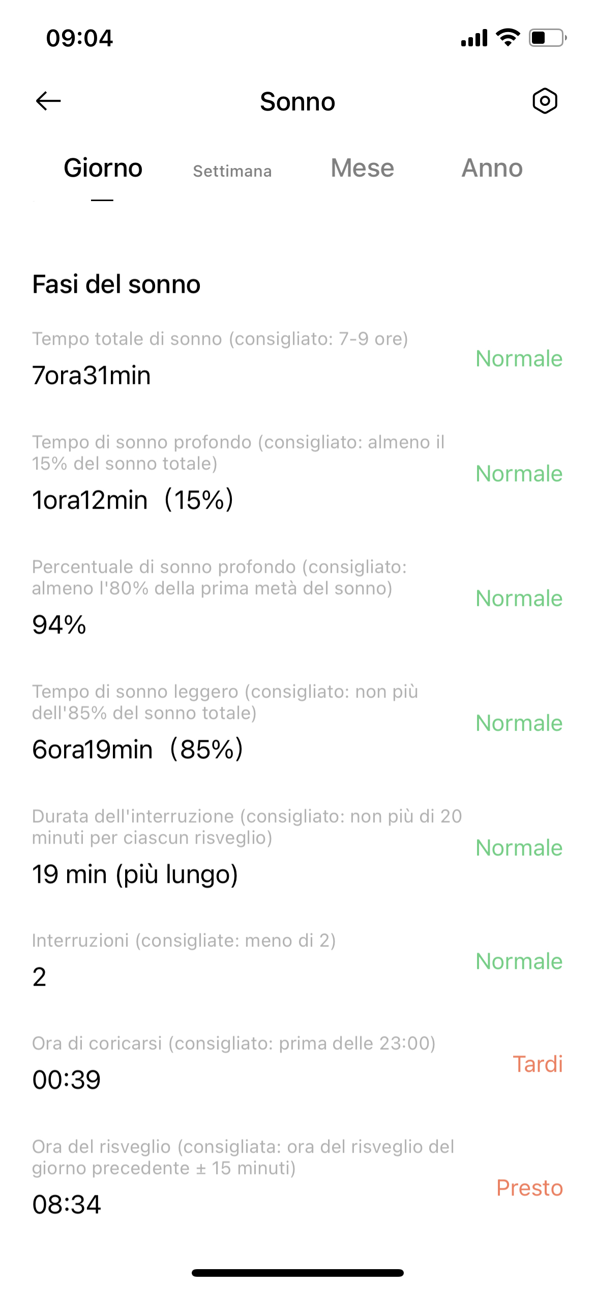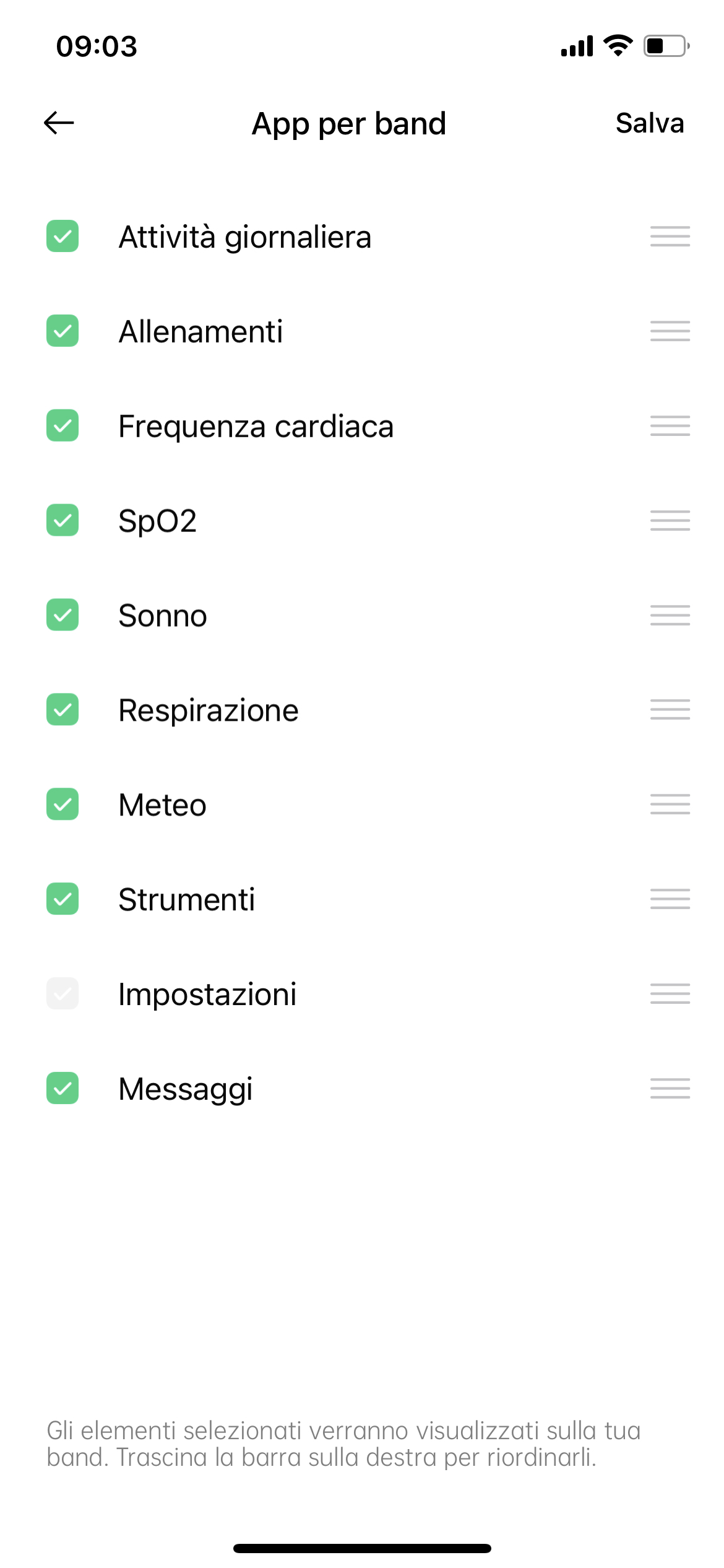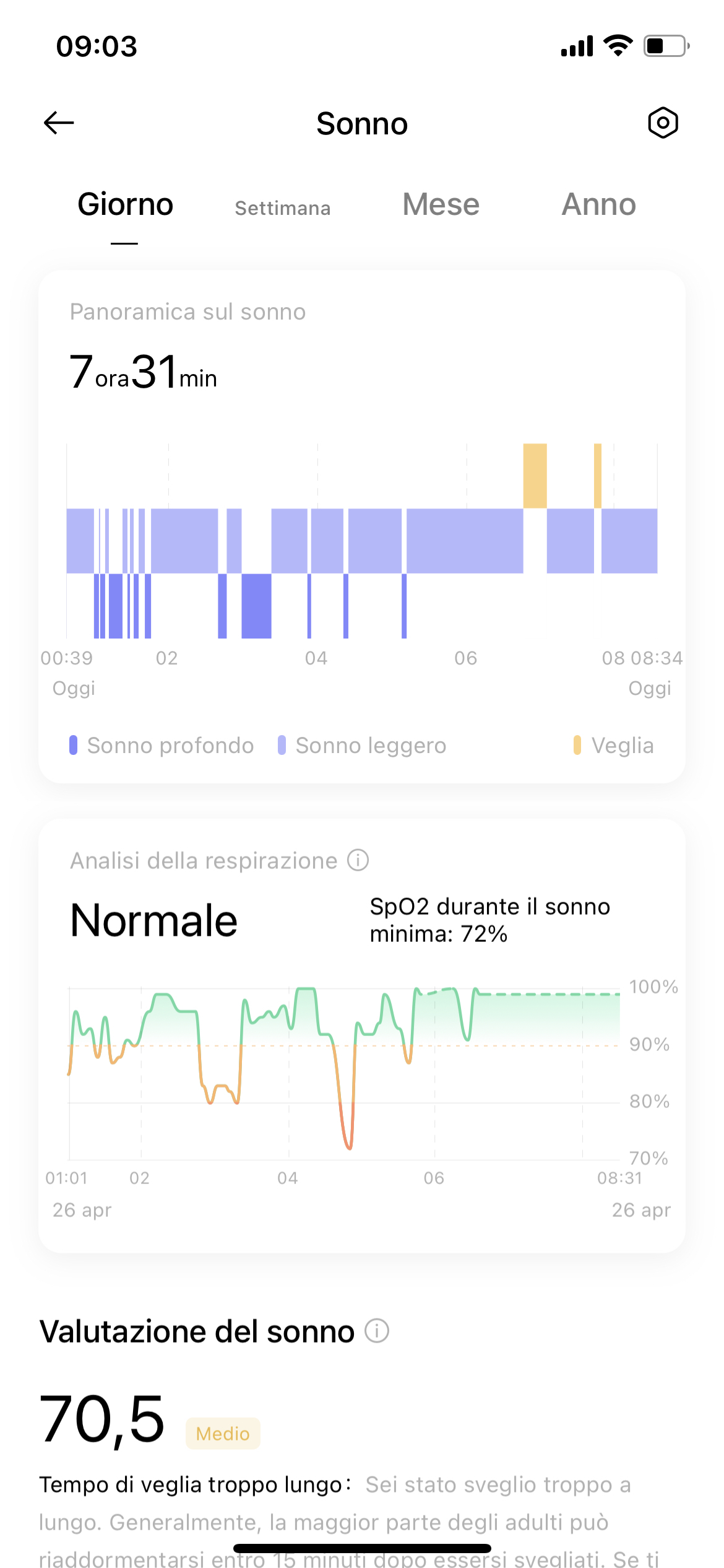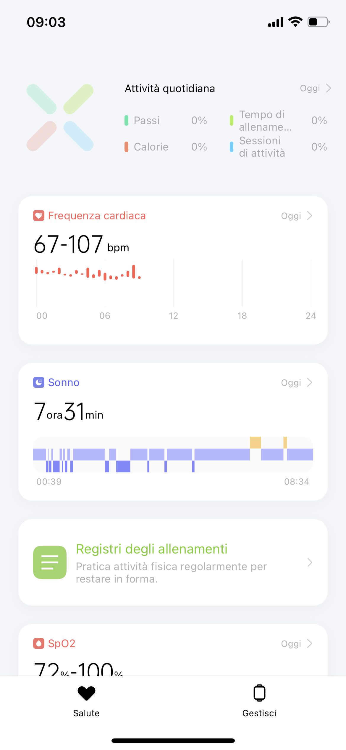 Per la nostra prima settimana di prova abbiamo impostato la misurazione della Sp02 ad intervalli regolari durante la notte, ma avrete la possibilità di scegliere una misurazione in tempo reale a discapito di una minore durata della batteria. Allo stesso modo abbiamo impostato il monitoraggio della frequenza cardiaca ogni 6 minuti. Gli avvisi di frequenza cardiaca a riposo sono disabilitati di default, ma possono essere attivati dallo meno principale in pochi istanti.