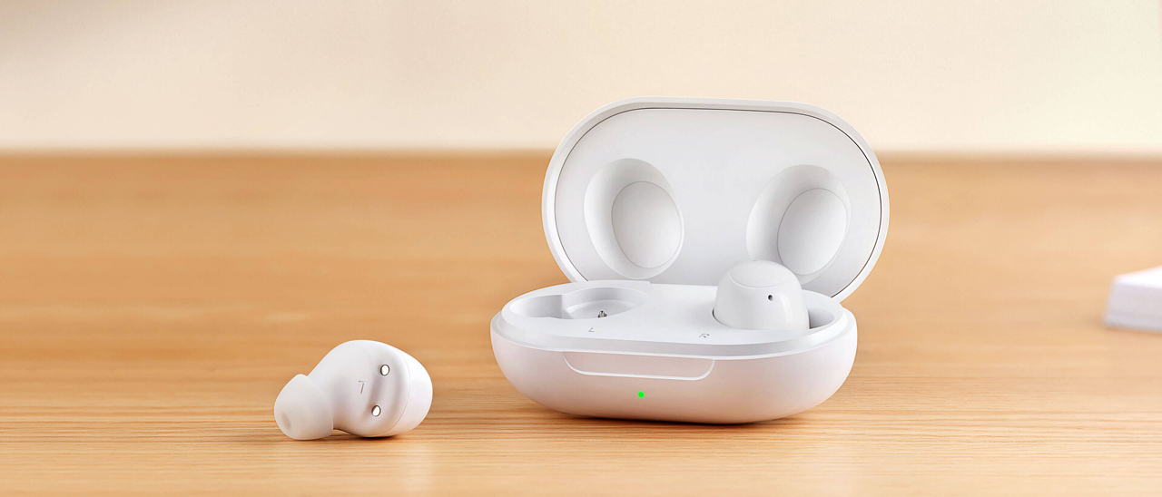 Per le nuove Enco Buds, OPPO ha deciso di optare per un design con auricolari a bottone piuttosto che con le asticelle stile AirPods – e il risultato finale una volta indossati è decisamente più discreto – e con una custodia di ricarica di forma ellisoide schiacciata.