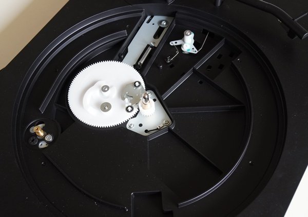 Sotto al piatto si vedono chiaramente i meccanismi che consentono al braccio di posizionarsi sul disco e di ritornare a riposo