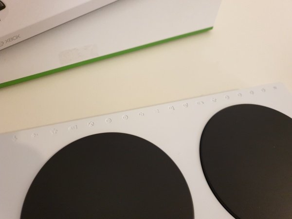 Xbox Adaptive Controller è molto diverso dal controller classico delle console Xbox One. Piatto, è stato progettato per potersi appoggiare facilmente sulle superfici piane. Sulla parte inferiore sono presenti degli attacchi dedicati a diversi tipi di supporti in modo da poter posizionare il controller praticamente ovunque, anche su treppiedi. Sul lato frontale sono presenti diversi connettori jack da 3,5 mm per collegare gli accessori esterni. Le porte USB si trovano sui lati. Molto particolare la parte superiore del controller dove sono presenti due pulsanti di grandi dimensioni che simulano i tasti B e A del controller. Presenti anche ulteriori pulsanti e il classico d-pad a croce dei controller canonici.