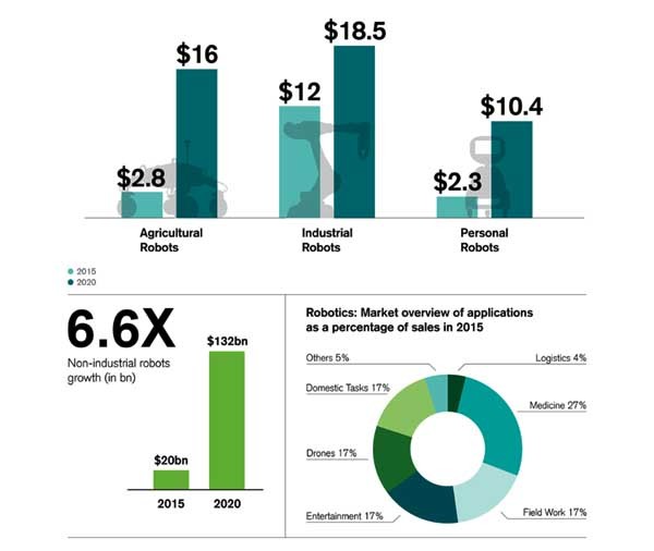 La velocità di accelerazione dello sviluppo della robotica è impressionante anche dal punto di vista degli investimenti. Un campo che influenzerà, senza dubbio, i decisori politici. Quando infatti un gigante come Credit Suisse, e altre banche internazionali, investono nella robotica considerandola come forma nuova di commercio, mobilità urbana ed extraurbana, servizi sanitari, turismo, l’affare si fa serio. Nel giro di cinque anni, dal 2015 al 2020, il fattore moltiplicativo degli investimenti sarà di 6.6, passando da venti miliardi di dollari a 132, con una tripartizione abbastanza equilibrata tra industria, agricoltura e servizi alla persona (personal robot). Tutte le società di investimento stanno cercando di prevedere i ricavi dalla robotica non-industriale, che potrebbero crescere di dieci volte tanto ogni 4 anni se si considera lo sviluppo dell’intelligenza artificiale e l’analisi delle grandi quantità di dati IoT che inizieranno a percepire i robot. Una massa tale per cui gli attuali social network sembreranno un giochetto da bambini. Anche in politica si scontreranno due visioni: contrariamente Donald Trump, ancora vincolato all’idea del lavoro umano come strumento di consenso pubblico, in Giappone il potenziale della robotica è stato riconosciuto dal ministro Shinzo Abe nel piano di crescita del paese.