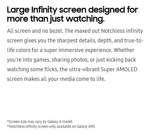 Il riferimento al display è stato scoperto sul sito indonesiano di Samsung. La pagina, prontamente rimossa, si può trovare nella web cache di Google. Non c’era nessuna immagine del Galaxy A90, ma si potevano leggere chiari indizi sul design. Nel testo erano indicate le parole “all screen” (tutto schermo), “no bezel” (nessuna cornice) e soprattutto “Notchless Infinity screen only available on Galaxy A90“. Lo smartphone avrà dunque uno schermo Infinity senza notch. Ciò esclude sicuramente i design Infinity-U e Infinity-V, ma non il design Infinity-O, come quello scelto per i Galaxy S10.
