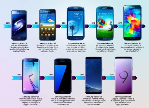 Prima di portare sul mercato i famosi smartphone Android, Samsung aveva già sviluppato diverse tecnologie, tra cui il display LCD per dispositivi mobile nel 2002 e la fotocamera da 10 megapixel con il telefono cellulare B600 del 2006. Il Galaxy S (2010) è il primo smartphone con schermo Super AMOLED (4 pollici) che offriva elevati livelli di contrasto e una maggiore fedeltà cromatica rispetto ai concorrenti dell’epoca. Il Galaxy SII (2011) è invece il primo della serie con processore dual core. La novità principale del Galaxy SIII (2012) è il supporto per il multitasking, grazie al quale è possibile eseguire due app allo stesso tempo.