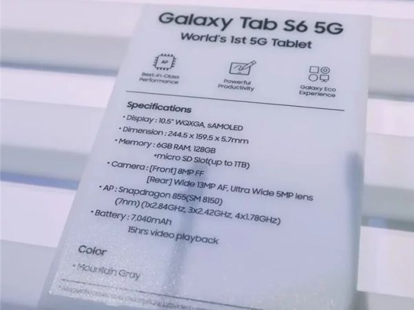 Le prime indiscrezioni sul tablet risalgono al mese di dicembre. Samsung ha confermato il lancio all’inizio del mese. Un sito cinese ha pubblicato le immagini del Galaxy Tab S6 5G e della targhetta con le principali specifiche. Non è chiaro però se il tablet è stato mostrato in segreto al CES 2020 di Las Vegas o in un altro luogo imprecisato. A differenza del Galaxy S10+ 5G, il produttore coreano ha conservato le caratteristiche del modello LTE, quindi l’unica novità è rappresentata dal modem 5G (Snapdragon X50).