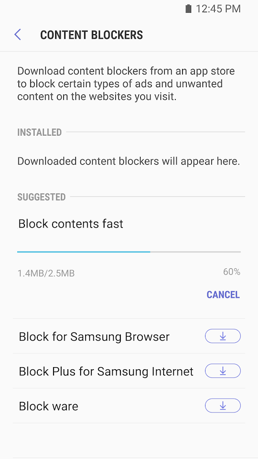 La versione beta permette di installare i content blocker direttamente dall’interno del browser con un solo tap. La funzionalità è tuttavia disponibile solo sui dispositivi Galaxy, in quanto basata sullo store Galaxy Apps. Per gli altri device viene invece visualizzato il collegamento al Google Play Store. Due i miglioramenti per l’interfaccia. Quando viene rilevata una web app nella barra degli indirizzi comparirà il pulsante “Aggiungi alla schermata home" (un pentagono con il + al centro), mentre per i siti di news verrà mostrato il pulsante per attivare il Reader Mode che lascia solo il testo della pagina.