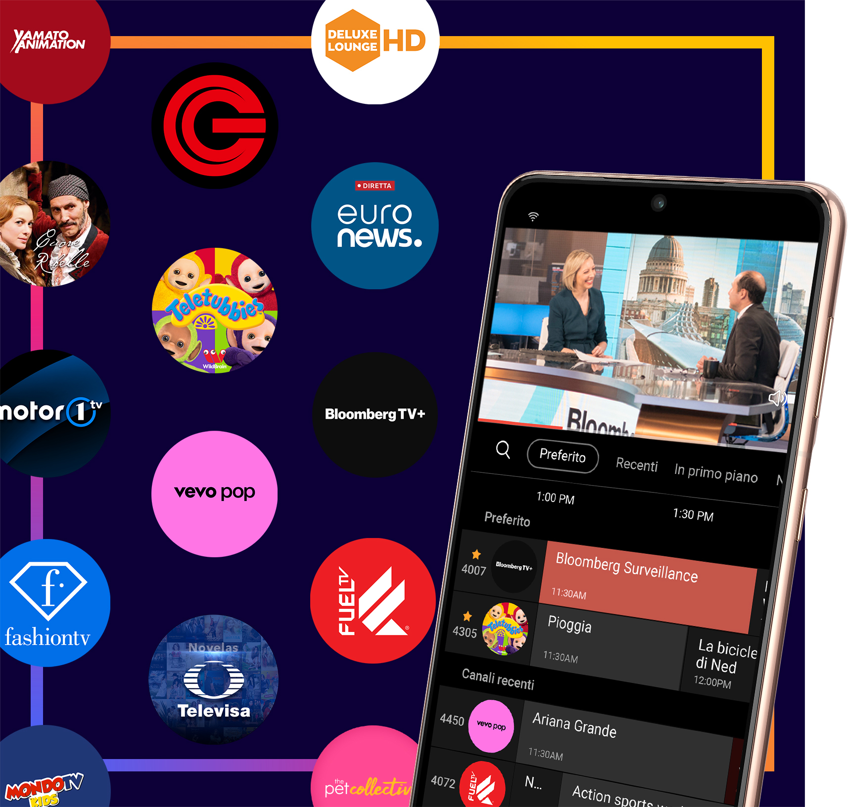 Dal 30 giugno, gli utenti di smartphone e tablet Samsung Galaxy potranno accedere quindi a contenuti di canali TV live e on demand gratuitamente, come ad esempio Vevo Pop, Clubbing TV, Fashion TV, Italian Fishing TV, Sportoutdoor TV, Motor 1 TV, Brindiamo!, Cinema Segreto, Bizzaro Movies, CG TV, Dark Matter Film e TV, Mondo TV Kids, Planeta Junior, Yamato Animation, Euronews Live, Bloomberg TV+, Teletubbies, Televisa Telenovelas e Cuore Ribelle.