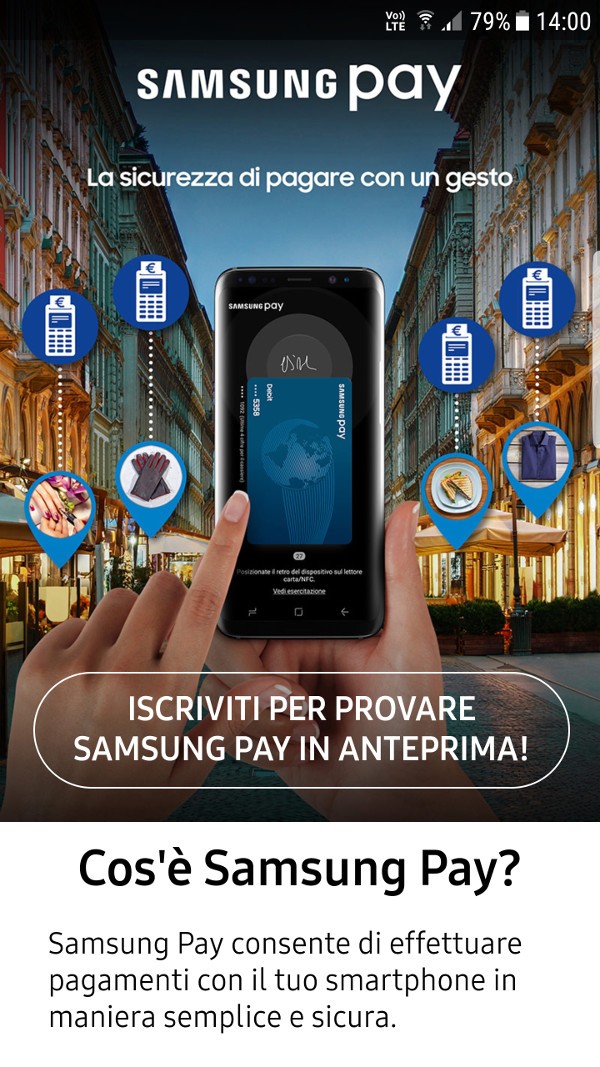 In concomitanza con il Mobile World Congress 2018, Samsung, senza tanti proclami, ha finalmente lanciato il servizio di pagamento anche in Italia. Come evidenziato, il servizio è ancora in fase beta e quindi bisognerà richiedere l’iscrizione per poterlo utilizzare. Partecipare a questo programma beta è davvero facile e non sembra, al momento, che sia previsto un numero massimo di partecipanti. Gli unici requisiti fondamentali per poter provare Samsung Pay sono il possesso di una carta di credito e la disponibilità di uno smartphone Samsung abilitato al servizio come il Galaxy Note 8, Galaxy S8, Galaxy S8+, Galaxy S7, Galaxy S7 edge, Galaxy A8, Galaxy A5 (2017) e Galaxy A5 (2016).