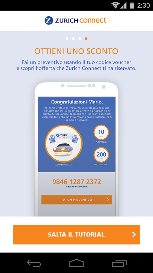 Trascorsi 30 giorni dal primo utilizzo e percorsi almeno 200 Km, l’app mostrerà un punteggio sulle abilità del guidatore che, eventualmente, può essere confrontato con quello degli amici. Gli utenti che hanno uno stile di guida virtuoso verranno premiati con uno sconto da utilizzare per la sottoscrizione di un nuovo contratto assicurativo RC auto Zurich Connect.