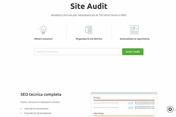 Grazie a Semrush si ha la possibilità di verificare la salute di un sito web lato SEO e analizzare le sue interazioni con Google. Lo strumento di punta è Site Audit, attraverso cui ciascun utente può eseguire un audit del sito e ricevere dopo pochi minuti soluzioni efficaci per risolvere eventuali problemi riscontrati durante l’analisi del crawler di Semrush. Tra gli errori più comuni riferiti alla SEO tecnica si possono citare la presenza di link interni rotti, la velocità di caricamento delle pagine web insufficiente e i meta tag mancanti.