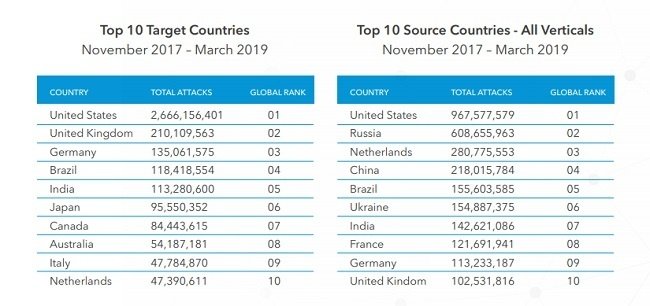 L’Italia non compare nella top ten dei paesi di origine degli attacchi web nel periodo novembre 2017 – marzo 2019, dove troviamo invece: USA al primo posto, seguito da Russia, Olanda, Cina, Brasile, Ucraina, India, Francia, Germania, Regno Unito. Il nostro paese è però nella top ten delle nazioni prese di mira dagli attacchi web sempre nel periodo novembre 2017 – marzo 2019. Dopo il solito USA al primo posto, seguono Regno Unito, Germania, Brasile, India, Giappone, Canada, Australia, Italia, Olanda.