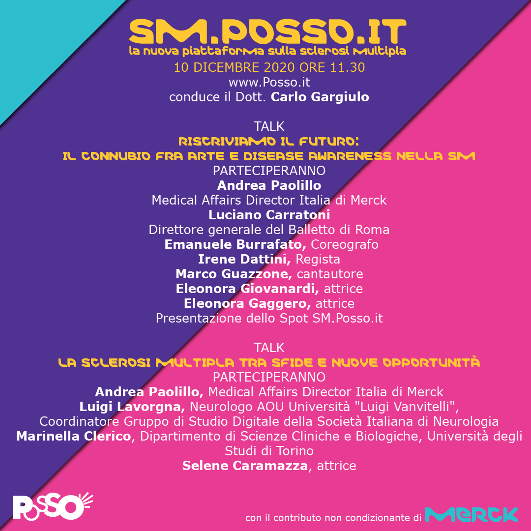 Nasce con il supporto di Merck, azienda leader in ambito scientifico e tecnologico, SM.Posso.it, un luogo virtuale dedicato alle persone affette da sclerosi multipla, dove i pazienti e i loro familiari potranno confrontarsi con medici ed esperti. Sviluppata dalla Piattaforma partecipativa Posso.it, nata durante il lockdown con la media partnership di Rai, Rai Com, Rai Cinema, Anica, Videocittà e CEI, SM.Posso.it è un servizio gratuito e dedicato ad una categoria di persone particolarmente impattate in questo periodo a causa delle difficoltà determinate dall’emergenza sanitaria in atto.