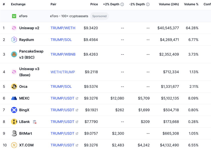 TRUMP, che presenta l’immagine dell’ex presidente con gli occhi laser come logo, è negoziato principalmente su DEX e CEX più piccoli, tra cui MEXC, BingX, LBank e BitMart.