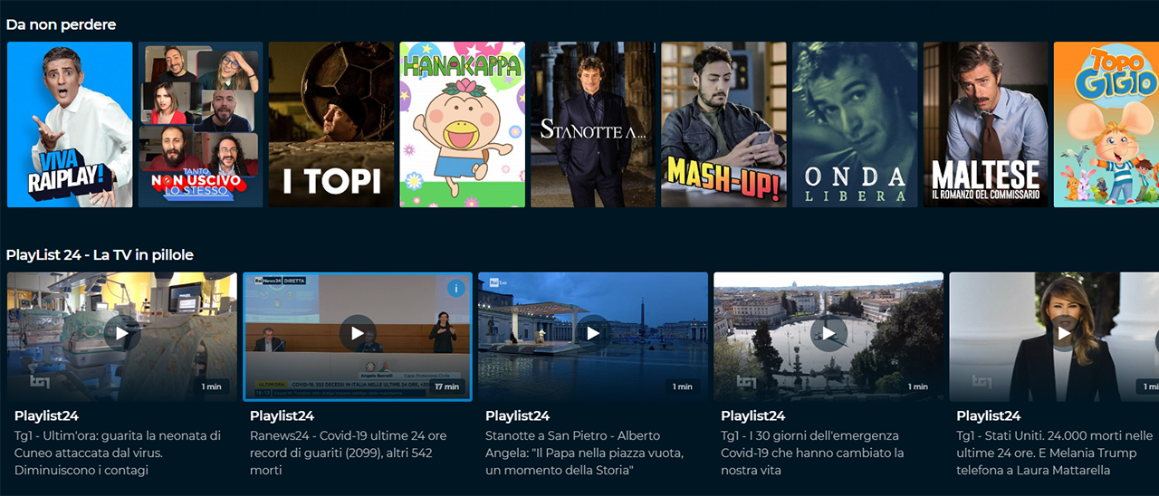 RaiPlay è il servizio streaming offerto da RAI, accessibile sia da browser che da smartphone, tablet e smart TV. La piattaforma è del tutto gratuita, richiede soltanto la registrazione di un account utente per beneficiare di tutte le funzioni, e consente di vedere ben 14 canali in diretta e una valanga di contenuti on demand. L’interfaccia è comoda e immediata, permette all’utilizzatore di scorrere tra i vari titoli senza difficoltà; inoltre, offre la possibilità di creare una lista di contenuti preferiti per accedervi con maggiore rapidità. Grazie alla funzione Guida TV, inoltre, c’è la possibilità di consultare la programmazione prevista per i vari canali, mentre Teche RAI permette di guardare sceneggiati e programmi che hanno segnato la storia di RAI.