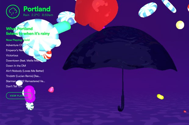Si tratta essenzialmente di un sito che suggerisce playlist sulla base delle condizioni meteo rilevate nei pressi di dove si trova l’utente, che a sua volta ha la possibilità di cambiare, scegliendo tra sole, vento, nuvole, pioggia, neve o notte serena. I brani sono consigliati sulla base delle preferenze rilevate analizzando le canzoni maggiormente riprodotte nelle varie città in relazione alle condizioni del tempo: ad esempio, con una giornata soleggiata si è soliti ascoltare musica allegra, mentre quando piove si opta per una colonna sonora più cupa. Queste le parole di Ian Anderson (no, non il leader dei Jethro Tull), responsabile della ricerca per Spotify.