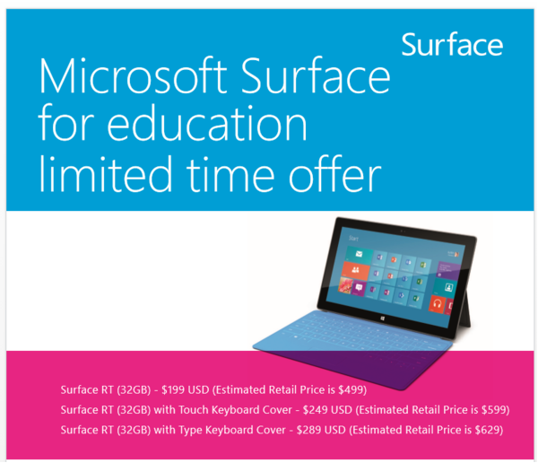 A partire dal 24 giugno, le scuole e le università potranno acquistare il tablet Surface RT da 32 GB pagando solo 199 dollari. L’offerta è valida anche in Italia, dove il prezzo sarà verosimilmente 199 euro. Ryan Lowdermilk di Windows Developer Show aveva pubblicato la notizia sul suo blog, indicando il 17 giugno come data, ma poco dopo Microsoft ha cancellato l’informazione e il form per effettuare l’ordine, caricato su SkyDrive.
